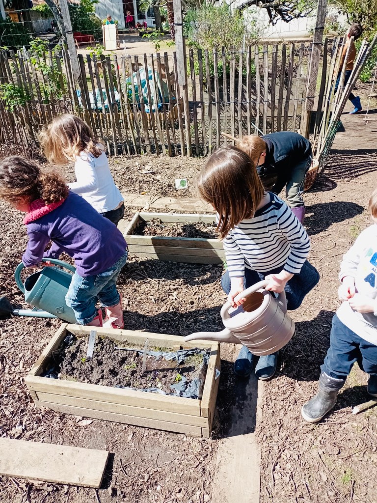 Si la nature nous offre beaucoup, il est nécessaire que celle-ci soit en pleine santé ! Nous sommes interdépendants. Nous souhaitons via l’école transmettre cela aux enfants. Cette sensibilisation se fait à travers de nombreuses lectures, discussions dans le jardin, la forêt ou la classe. Les enfants participent à l’entretien du jardin et du potager.