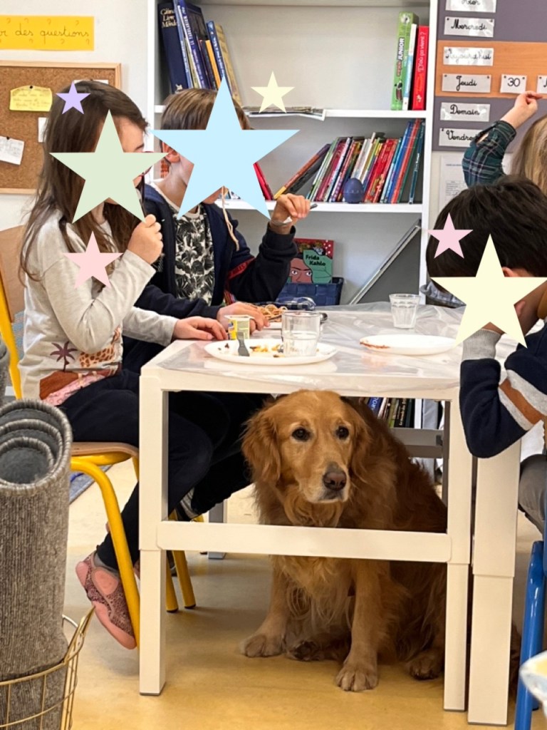 - Soin des animaux de l’école, présence de la chienne golden retriever dans l’ambiance pour la médiation animale